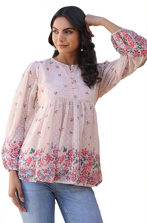 - Style:- Length: 27(inch) | Pattern: Floral Print | Occasion: Casual | Type: Flared| Sleeve Type: Full Sleeve (Puff Sleeve) | Color: Peach