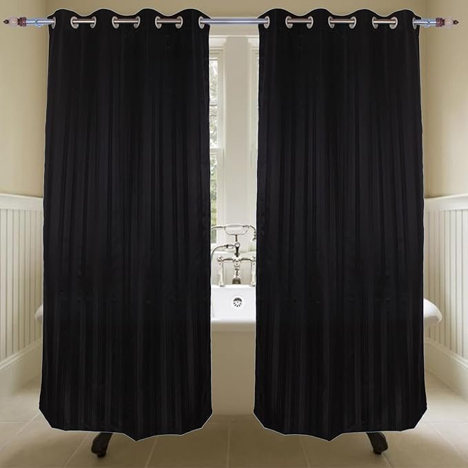 - Plain Polyester Water Repellent Fabric Curtain- These curtains are made of polyester Fabrics. The Designs on the bath Curtain look attractive and make it quite charming. These shower curtains are made of top quality treated polyester which are waterproof. This helps the water to slide down making them the right choice.