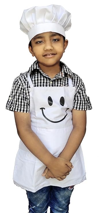 - Package content: 1 smiley print kids apron with cap Easy for maintain, wash with warm or cold water in machine or by hand