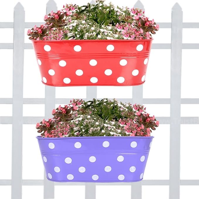 - Fascinating Colorful Oval Metal Planters with polka Dots: Red, Purple.