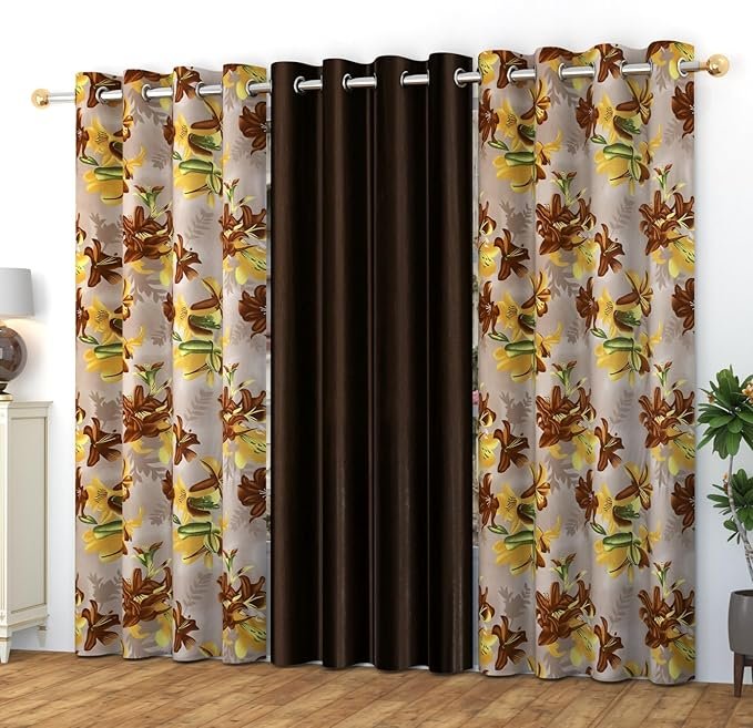 YUKANY Digital Printed Eyelet Curtains for Home Decor I Pack of 3 I (Brown, 4 X 5 Feet)